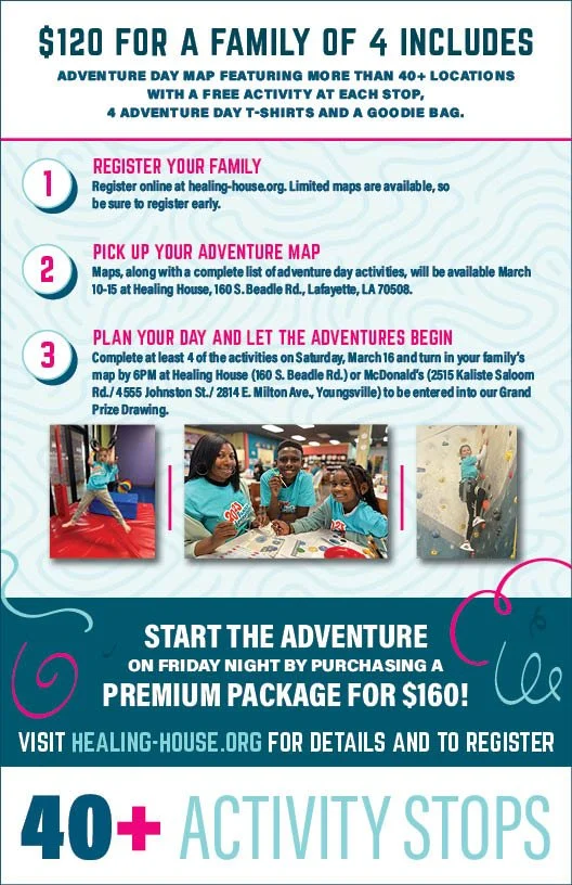 Family Adventure Day is a fundraising event organized by Healing House that encourages families to explore Lafayette via an “adventure map” populated with more than 35–40 local locations offering free activities. Participants must complete a certain number of these mini-adventures in one day to qualify for prizes. The registration fee (around $120–$160) supports the services offered by Healing House, which provides grief support and education for children and families in the Acadiana region.